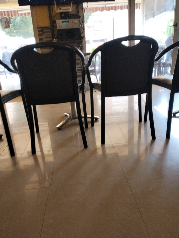 The image captures the interior of a location, possibly a cafe or restaurant, in Ouaouizert, Morocco, looking towards a large windowed exterior. The floor is covered with light-toned, reflective square tiles. In the immediate foreground, two identical dark-colored chairs, constructed with a rounded backrest featuring a central cut-out, are positioned facing away from the viewer. Their black legs and reflections are visible on the polished floor. A polished metallic table base with four legs is situated between these two chairs. Additional similar dark chairs are partially visible on the far left and right. Against an interior wall section, behind the chairs and partially obscured, a stack of electronic components is visible. This includes a silver-colored audio receiver or amplifier with a digital display and control knobs, mounted below a dark, flat-panel screen. The wall behind this equipment appears to have a textured, possibly tiled, surface. Through the large glass windows, an exterior scene is visible under bright light. An orange and white striped awning extends above the outside area. Blurred shapes outside include faint indications of a person walking on the far left, other outdoor furniture, and indistinct building structures in the distance. No direct actions or interactions are depicted within the frame.