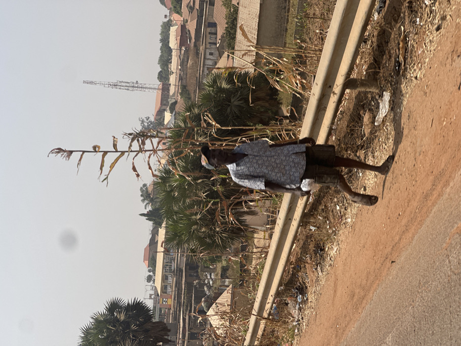 The scene depicts an outdoor environment in Sabon Tasha, Nigeria, under a hazy daytime sky