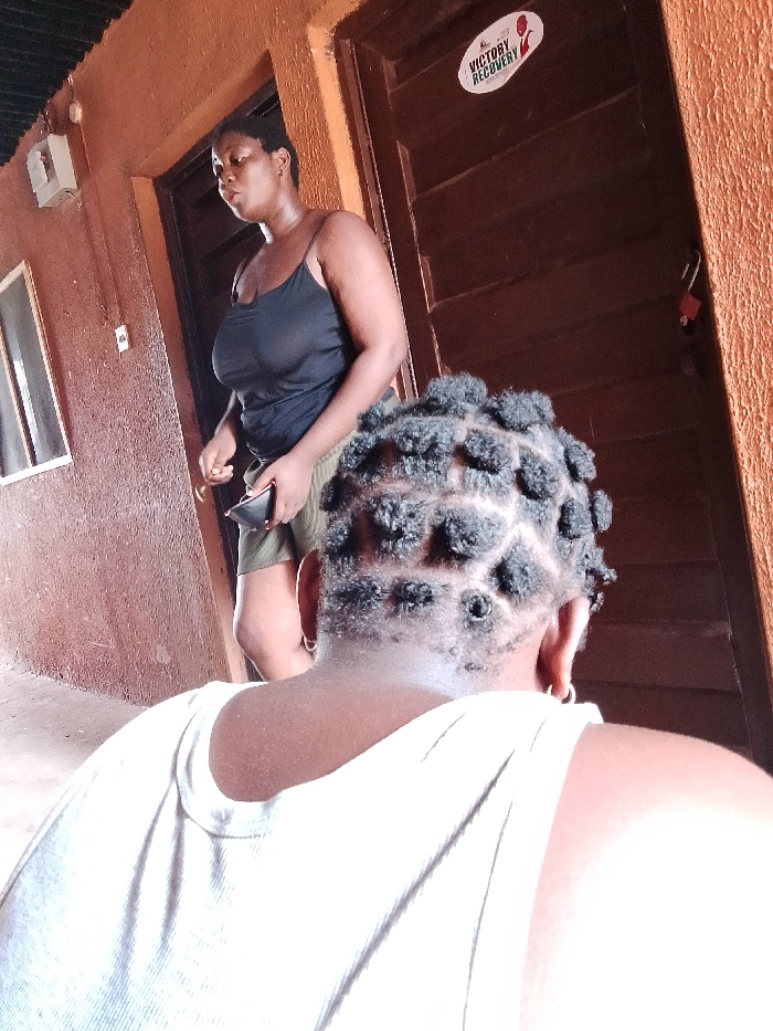 The image depicts an indoor/outdoor transitional space within a building in Agbor, Nigeria, featuring two individuals. In the foreground, the back of a person, likely female, is partially visible from the shoulders up, wearing a light-colored, possibly white, ribbed tank top. This individual's dark hair is styled in numerous small, rounded knots or twists, arranged with visible scalp partings in a zig-zag pattern. A small silver hoop earring is discernable on the left ear. In the middle ground, a second woman stands facing slightly left, positioned to the right of an open doorway. She wears a black spaghetti-strap tank top and dark, possibly olive green, shorts. Her hair is short and dark. She holds a dark-colored smartphone or similar rectangular object in her left hand and appears to be manipulating a small object or performing an action with her right hand near her left palm. The immediate environment consists of a reddish-brown textured wall. Two dark brown, louvered doors are present, one directly behind the standing woman, and the other to her right. The door on the right bears a white oval sticker inscribed with "VICTORY RECOVERY" and a red graphic. A small rectangular window with a white frame is visible on the wall to the far left. Above this window, a small white electrical junction box or fixture is mounted. The upper portion of the scene reveals a dark corrugated metal roof.