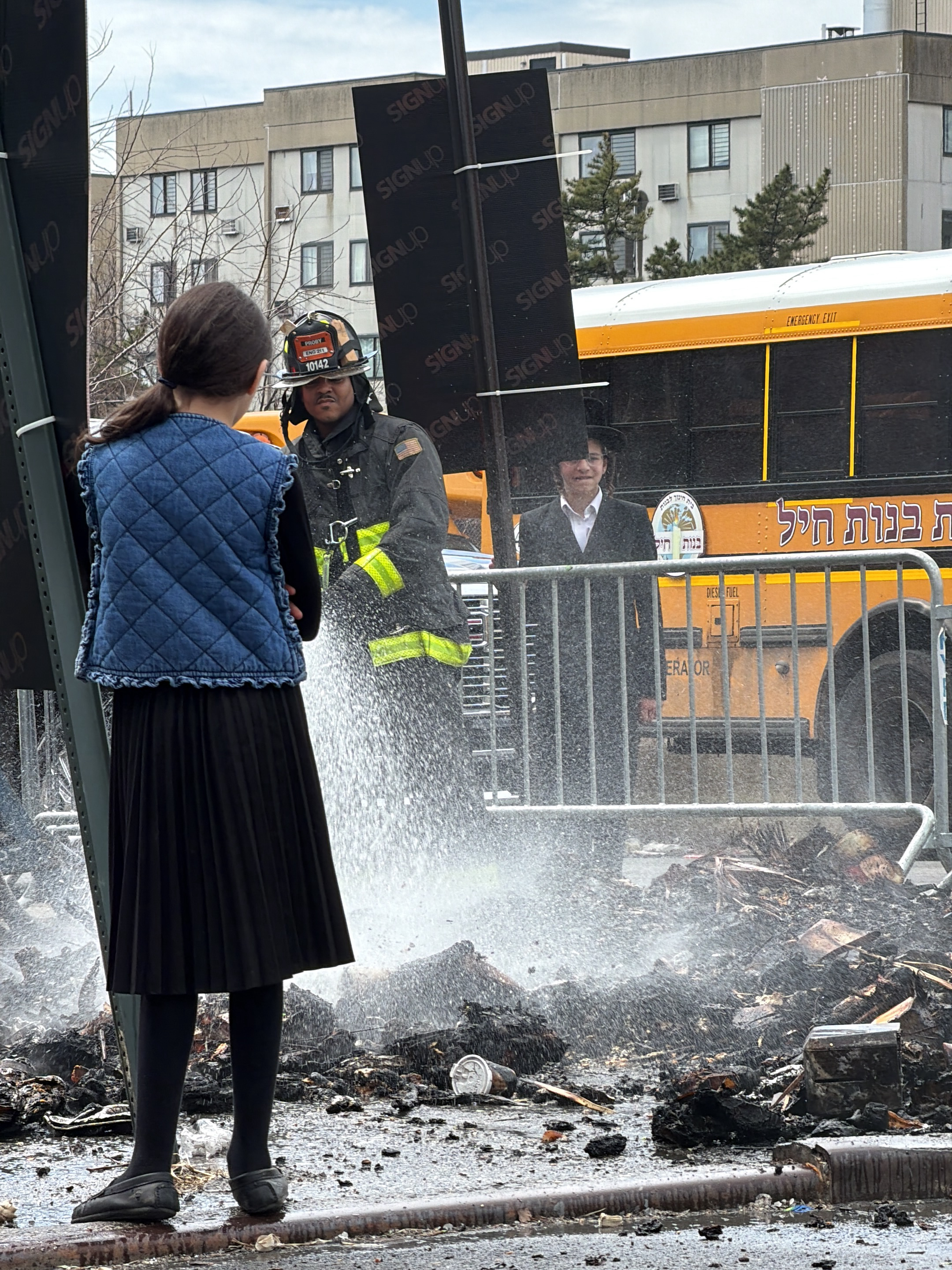 The image captures a scene with a mix of individuals and environmental elements. In the foreground, a girl with long, brown hair tied back in a ponytail stands with her back to the viewer, wearing a blue quilted vest, black dress, and dark tights. Near her, a firefighter in full gear, including a helmet and protective suit, is directing a stream of water at a smoldering pile of debris on the ground. Behind them, an individual in traditional Hasidic Jewish attire, including a black hat and coat, stands near a yellow school bus. The bus has Hebrew writing on the side. A metal fence and black signs are also visible in the shot. In the background, a multi-story building can be seen. The aftermath of some kind of fire or incident is indicated by the debris and water spray. The location seems to be in an urban area, possibly New York City.