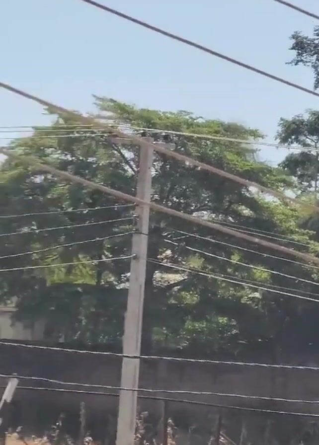 n outdoor view with several layers. In the foreground, there are multiple power lines stretched across the view. Beneath the power lines, there is a corrugated metal roof of a small structure, along with some dry grass and weeds. In the midground, there is a concrete wall and behind it a lush area of green trees and other plants. Higher up there is a rocky outcrop with boulders and some sparse vegetation. The sky above is clear and blue. The video appears to be taken from a moving vehicle. The audio is dominated by rhythmic music with a strong bass.