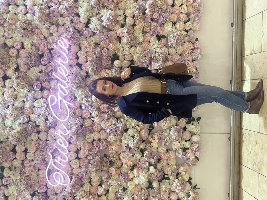 An adult female is depicted standing indoors, centrally framed, in front of a decorative wall composed entirely of artificial flowers in shades of white, cream, light pink, and lavender. A purple-pink neon sign displaying the words "Trier Galerie" in a cursive script is mounted on the flower wall behind her. This identifies the location as Trier Galerie, a shopping mall situated in Trier, Germany. The woman possesses dark, shoulder-length hair and light skin, accentuated by red lipstick. She is attired in a dark blue, double-breasted pea coat featuring gold-colored buttons, a light beige ribbed knit top, blue denim jeans with cuffed ankles, a brown belt with a gold-colored buckle, and brown wedge-heeled ankle boots. Accessories include gold-colored hoop earrings and rings on her right index and ring fingers. A brown shoulder bag with a ribbed texture hangs from her right shoulder. She faces the viewer directly, exhibiting a slight smile. Her right hand is raised towards her hair/neck, with fingers slightly splayed, while her left hand is positioned within her coat pocket. The floor is composed of light-colored, reflective tiles arranged in a grid pattern. A thin, horizontal metal rail is visible along the base of the flower wall, just above the floor.