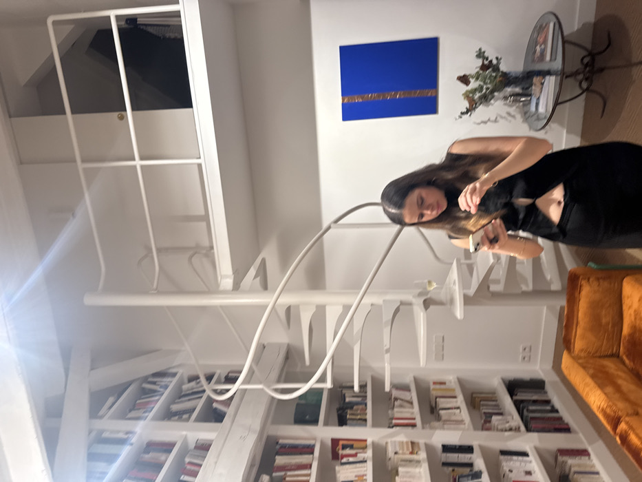 A woman with long, dark hair wearing a black dress stands on a spiral staircase, looking at her phone. The white staircase curves downwards, flanked by bookshelves filled with books. A blue and gold painting hangs on the wall above, along with a small round table holding a vase of flowers. An orange couch is visible on the right side of the image. The room has a high ceiling and is brightly lit.