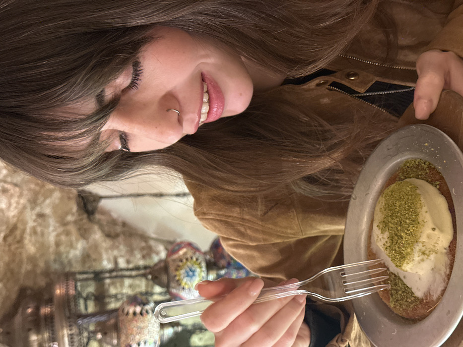 A woman smiles at the camera, holding a plate of dessert, possibly künefe, topped with cream and pistachios. She is using a clear plastic fork. She wears a brown jacket, and her brown hair is styled with bangs. In the blurred background, there are ornate lanterns and what appears to be décor in a Middle Eastern style. The image is taken from a slightly angled perspective, creating a casual, personal feel.