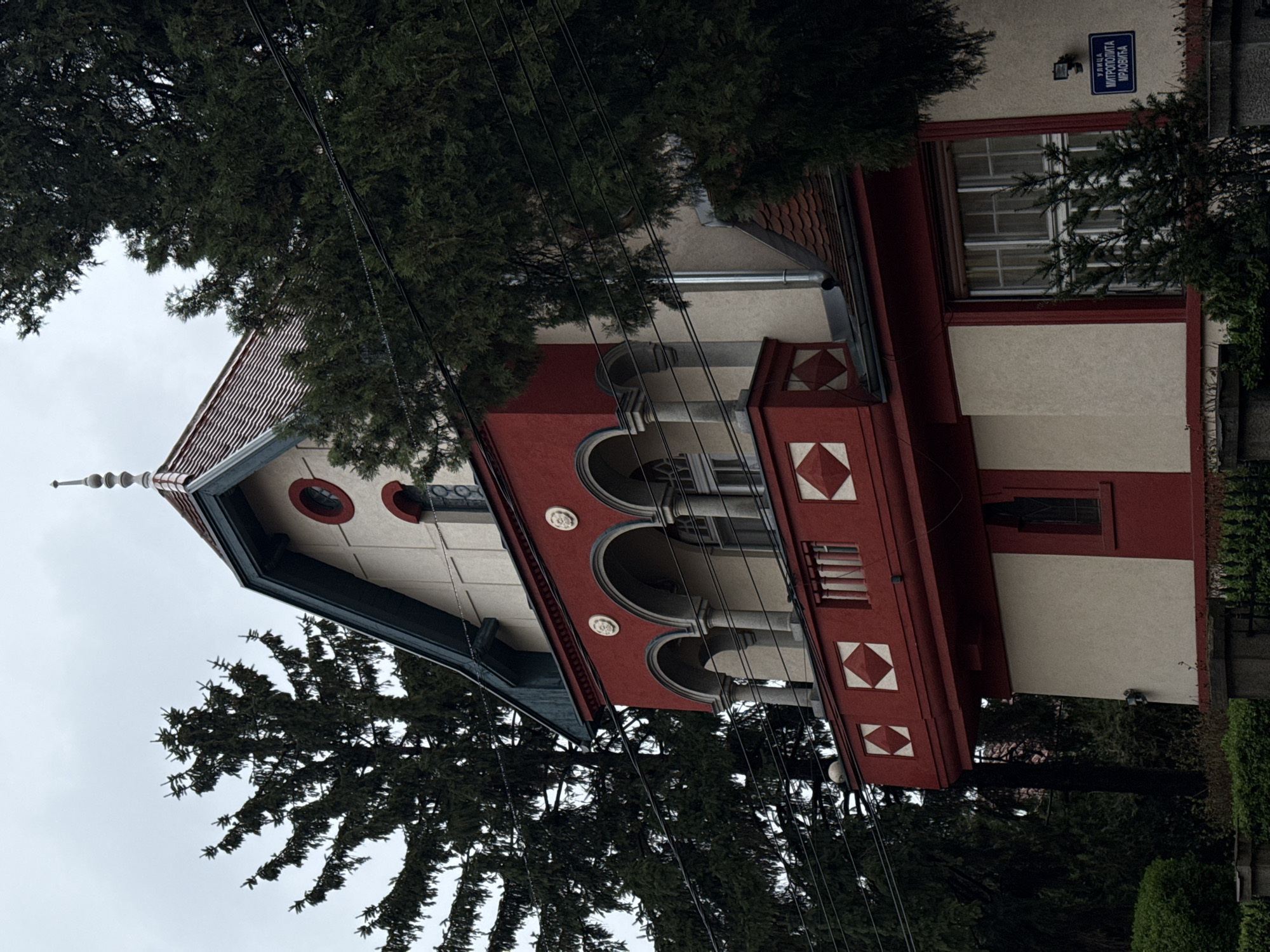 The image depicts a building with distinctive architectural features, including a red and white facade, arched openings supported by columns, and a decorative roof with a spire. The building is partially obscured by trees, with branches and foliage covering parts of the structure. A street sign is visible on the right side of the building, indicating that the location is Улица Митрополита Иноћентија (Ulica Mitropolita Inoćentija), which is the Serbian Cyrillic spelling for Metropolitan Innocent Street. This is located in Belgrade, Serbia. The sky appears overcast, and the lighting is diffused. Overhead power lines are present in the foreground.