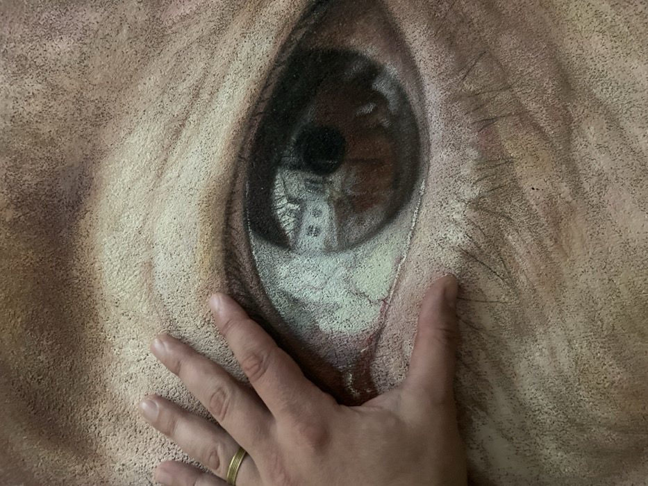 - "The image displays a human left hand positioned against a large-scale, hyperrealistic mural of a human eye, located in the city of São Paulo, Brazil" by FM-iYMz92, licensed under CC BY 4.0
