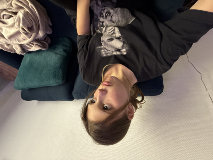 young female indoors, seated on a dark blue two-seater sofa