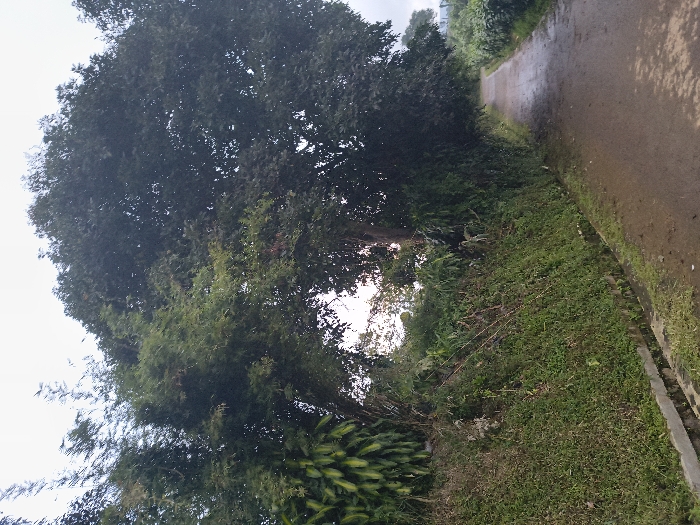 A damp, narrow road angles right, lined with verdant grass and a concrete curb. A large, leafy tree dominates the left side, its branches reaching towards the sky, partially obscuring a bright, cloud-streaked horizon. Below the tree, dense vegetation including bamboo-like plants thrives. The scene exudes a sense of nature and tranquility.