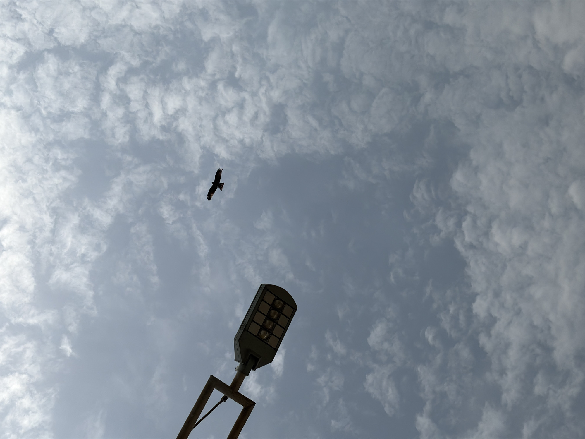 The image is an upward-looking shot taken in Igboefon, Nigeria. The sky is overcast with a dense formation of altocumulus clouds. In the lower part of the frame, a modern LED street lamp is visible; it is grey and mounted on a weathered metal support structure. A bird, silhouetted against the cloudy sky, is captured in flight, positioned slightly left of center in the frame.