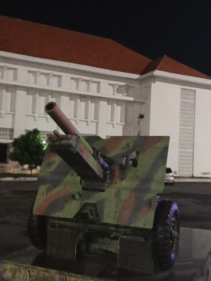 A field artillery cannon, painted in a disruptive camouflage pattern of olive green, dark brown, and black, is depicted centrally, elevated on a dark, rough-textured pedestal. Its main barrel, with a visible reddish interior, is angled upwards and slightly towards the left. The cannon features two prominent dark wheels, the rightmost reflecting a faint purple luminescence. In the background, a large, illuminated white building with a distinctive reddish-orange tiled roof spans horizontally. The building's facade is adorned with multiple rectangular pilasters, casting vertical shadows. Vertical louvered or grate-like panels are visible on the right section of the building. To the left of the cannon, a small, dark green tree stands. The ground surface in the middle ground appears dark and wet. A silver car is partially visible in the far right background, parked on the dark pavement. The scene is illuminated by artificial light against a dark night sky. This scene is located on the grounds of Lawang Sewu in Semarang, Indonesia.