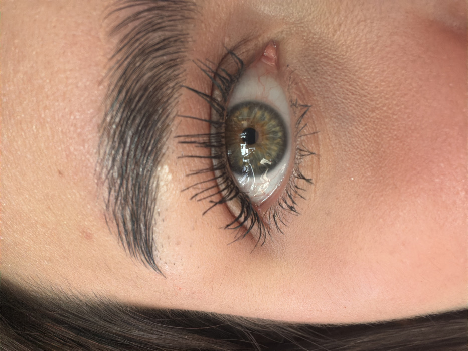 The image is a detailed close-up of a human right eye. The subject exhibits light to medium skin tone on the visible portions of the face, with fine hair follicles and skin texture discernible. The eyebrow is dark, dense, and styled with individual hairs brushed upward, giving it a groomed appearance. Upper and lower eyelashes are dark, elongated, and coated with mascara, displaying some adherence or clumping between individual lashes. The iris is multifocal, predominantly green with interspersed brown and amber tones, surrounding a central black pupil. The sclera is white, with minor red vascularization visible near the inner canthus. Reflections within the iris indicate two distinct rectangular light sources, consistent with an indoor, artificially lit environment. No specific geographic location, such as Veracruz City, Mexico, is discernible from the visual evidence provided.