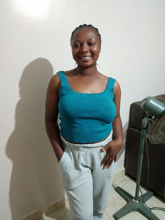 A woman smiles at the camera, wearing a teal tank top and light gray sweatpants. Her dark hair is braided away from her face. She stands with one hand in her pocket and the other resting lightly on her hip. Behind her is a cream-colored wall, shadowed by her figure. To her right stands an antique, light-green electric fan, placed beside a dark leather-look sofa. The scene appears to be indoors, possibly in a home setting.