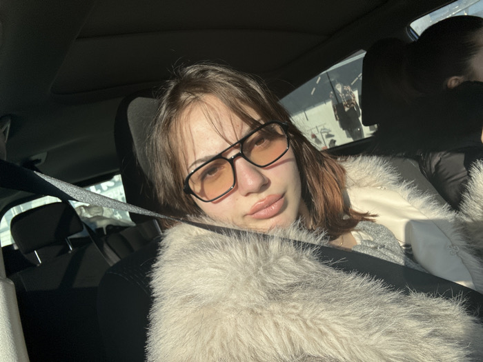 A young adult female is depicted seated in the front passenger seat of a vehicle, directly facing the camera. She possesses shoulder-length brown hair and wears dark-framed glasses with orange-tinted lenses. Her attire includes a light-colored jacket featuring a voluminous light beige faux fur collar and trim, layered over a grey garment. A black seatbelt crosses her left shoulder and chest. Behind her, in the rear seat, a second individual with dark hair is partially visible, with their head and upper torso obscured. The vehicle's interior features black upholstery, headrests, and a discernible sunroof. Strong natural sunlight illuminates the scene from the passenger side. Through the rear window, a blurred exterior environment is visible, consistent with a commercial or urban setting, showing indistinct structural elements and a faint figure in patterned clothing. The specific location within the city of Vendenheim, France, is not discernible from the visual information provided in the image.