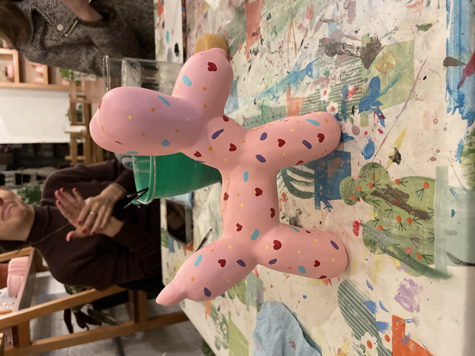 A pink, balloon animal figure with colorful sprinkles sits on a paint-splattered surface