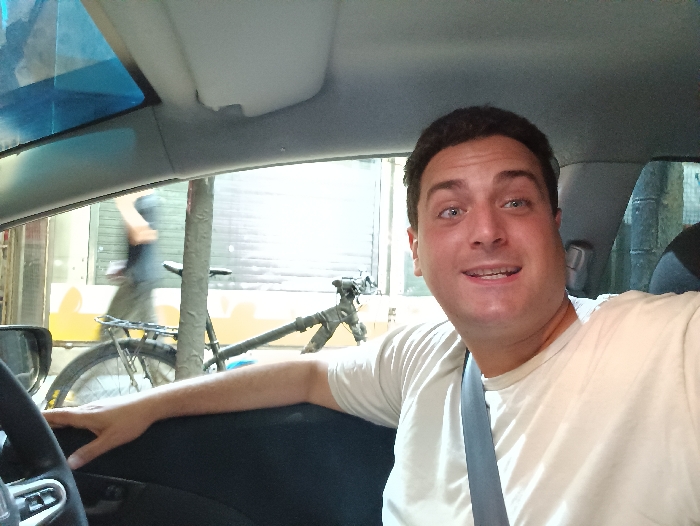 A man takes a selfie inside a car. He has short, dark hair, light skin, and blue eyes. He wears a white shirt and a gray seatbelt. The car’s interior is visible, including the steering wheel, dashboard, and roof. Outside the window, a bicycle and a blurred figure can be seen on a city street. The lighting is bright and appears to be daytime. The man is smiling slightly.