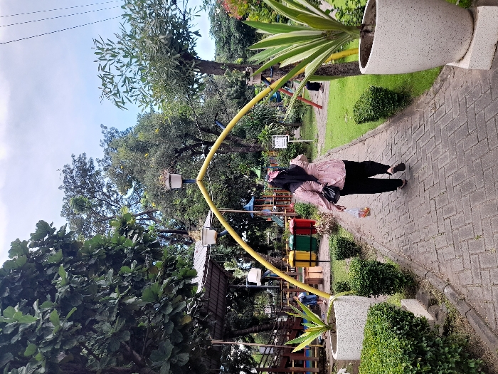 woman walking on a paved path in a park. The path is made of gray bricks and is surrounded by green grass and bushes. The woman is wearing a pink hijab and a pink and white blouse, black pants, and black shoes. She is carrying a small bag on her shoulder and a bag of food in her left hand. There is a yellow archway over the path, and a playground area to the left. The playground includes slides, swings, and a small climbing structure. The woman is walking away from the playground. In the background, there are trees and bushes. The park is located in Kecamatan Sidoarjo, Indonesia, near latitude -7.441 and longitude 112.705.