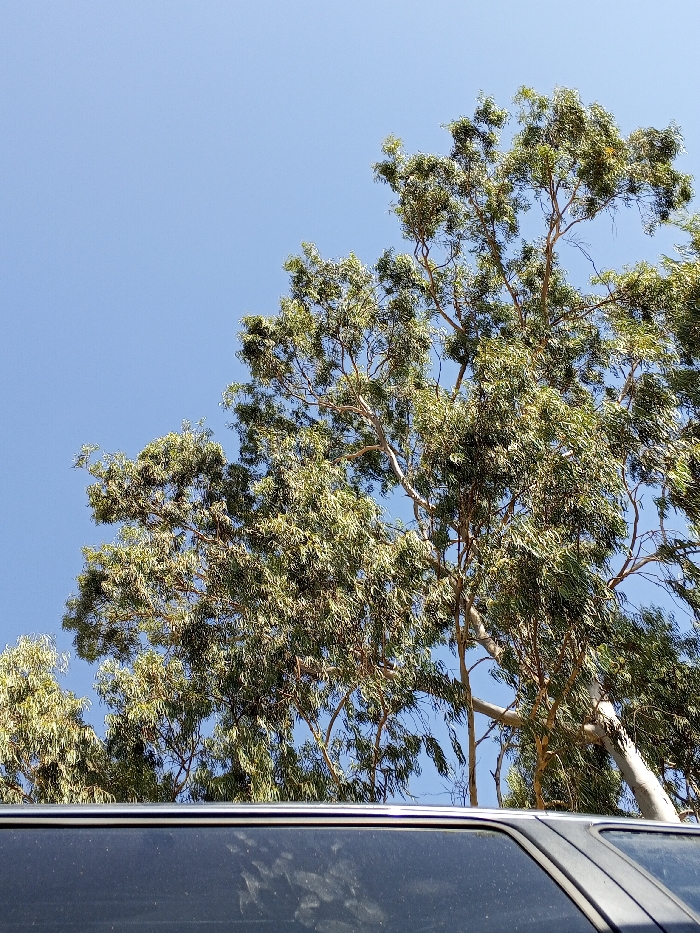The scene depicts a clear, light blue sky occupying the upper and left portions of the frame. Dominating the right and central areas is the dense green canopy of a large tree, characterized by numerous elongated leaves and visible light-colored branches. The lower segment of the image reveals the dark-colored roof and the top edge of a window of a vehicle, possibly an SUV or car, positioned in the immediate foreground. The window appears dark or tinted. The environment suggests an outdoor setting under direct sunlight within the city of Durimi, Nigeria. No individuals or specific actions are discernible.