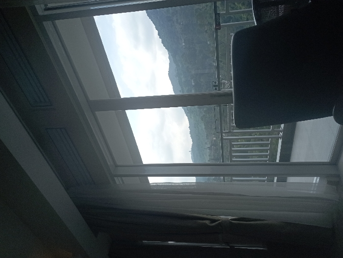 The image depicts an indoor scene in Batulawang, Indonesia, looking outward through a large sliding glass door to a balcony and a mountainous landscape. In the immediate foreground on the right, the dark backrest of a chair obscures a portion of the view. To the left, a sheer white curtain is partially drawn over a darker beige curtain. The top of the interior space features a light-colored valance with integrated rectangular air vents. The white-framed glass door opens onto a balcony with a concrete floor and a white metal railing composed of vertical balusters. Beyond the balcony, a verdant mountainous terrain is visible under a cloudy sky. A slender tower structure is discernible on the distant mountain peak to the left. No individuals or specific actions are depicted.