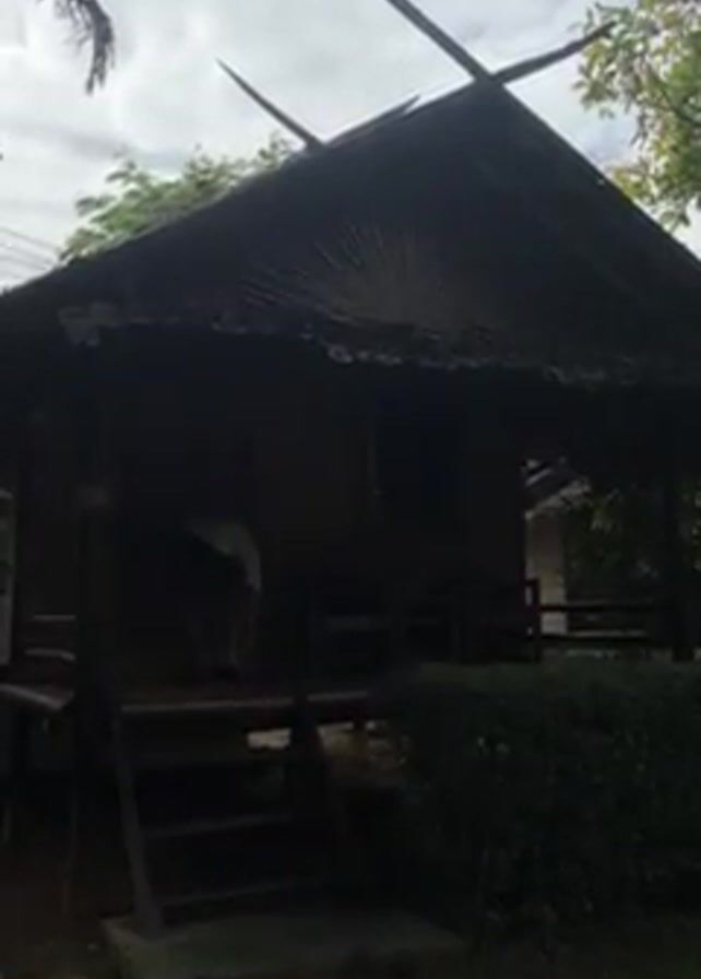 small, dark-colored building, possibly a bungalow or hut, with a thatched roof adorned with two pointed sticks at the apex. There's a set of stairs leading up to a porch, where a person wearing a white shirt and dark shorts is visible. The building is surrounded by greenery, including trees and bushes. The sky overhead is cloudy.