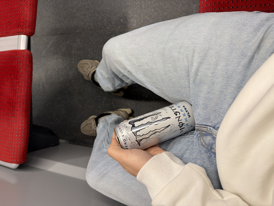 The image presents a first-person, downward-angle view of an individual seated in a public transport vehicle, likely a train or subway car, within or serving the city of Fürth, Germany. The subject's legs are clad in light blue denim jeans, with a portion of a white long-sleeved garment visible on the left side of the frame. The left hand of the subject holds an open, silver and white Monster Energy Ultra energy drink can, prominently displaying the "M" claw logo in light blue and grey, and the text "ZERO ZUCKER" near the top. Below the subject's knees, a pair of beige sneakers with dark soles rest on the dark grey, subtly textured floor. To the right and partially obscured by the subject's leg, a section of a red, patterned fabric seat, characteristic of public transport, is visible. A plain light grey partition or wall runs along the left side of the frame.