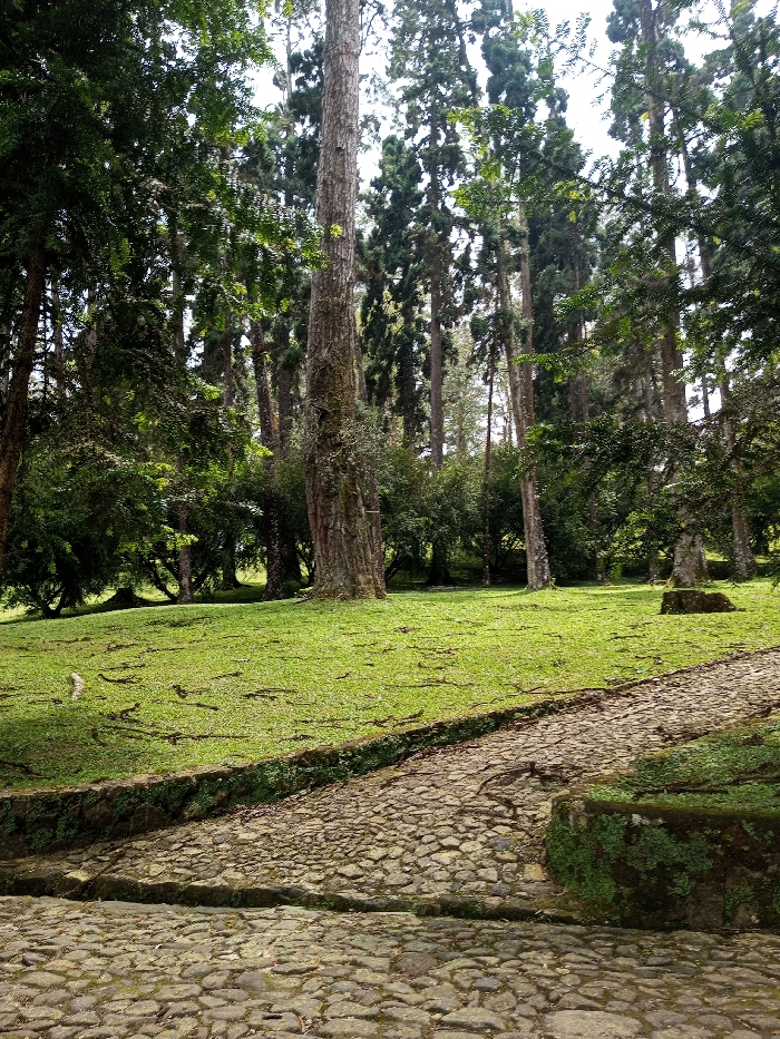 A stone pathway with moss-covered edges leads up a gentle slope into a sun-dappled green glade. Tall, slender trees with textured bark dominate the scene, casting shadows across the grassy expanse. Root systems are visible above the grass, and dense foliage lines the perimeter, creating a sense of depth and enclosure. The overall impression is one of serene natural beauty.