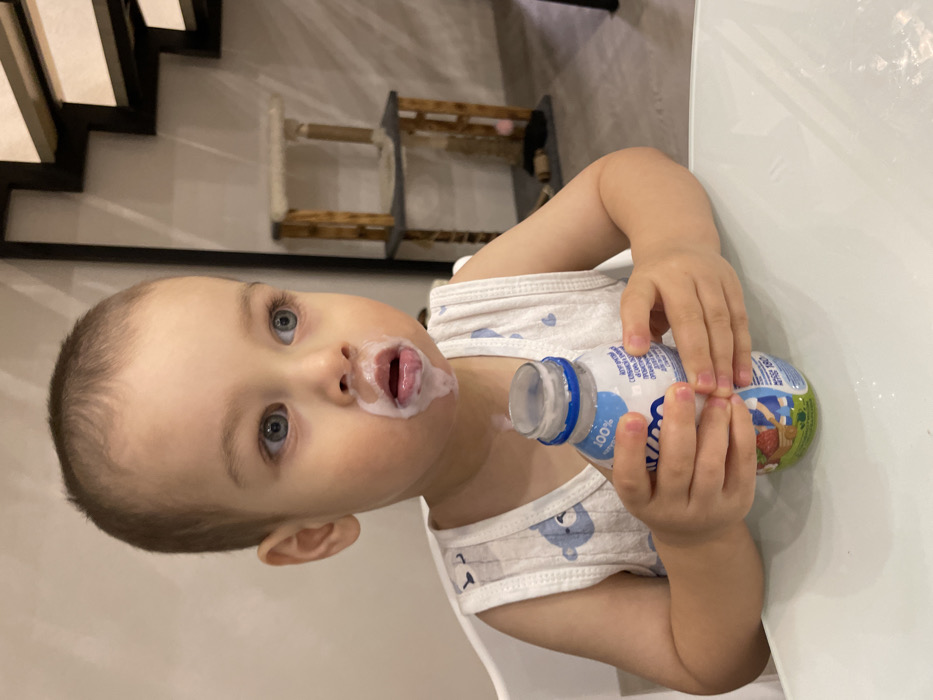 - "A baby with blue eyes drinks from a bottle, his face smeared with white liquid" by FM-NoKcg2, licensed under CC BY 4.0