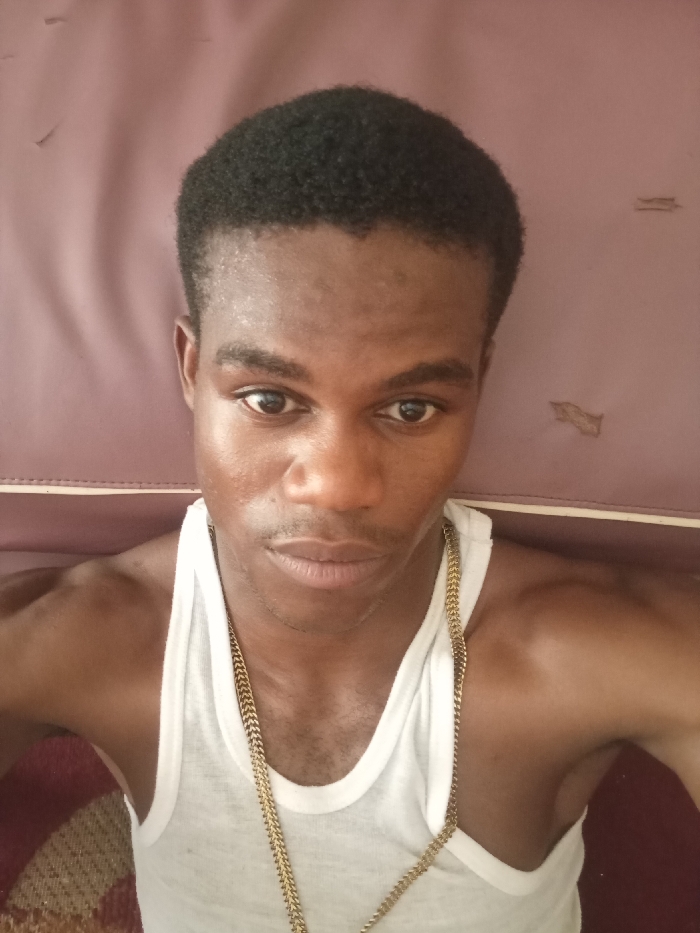 The image is a close-up portrait of a young adult male with dark skin, short black hair, and dark eyes, looking directly at the viewer