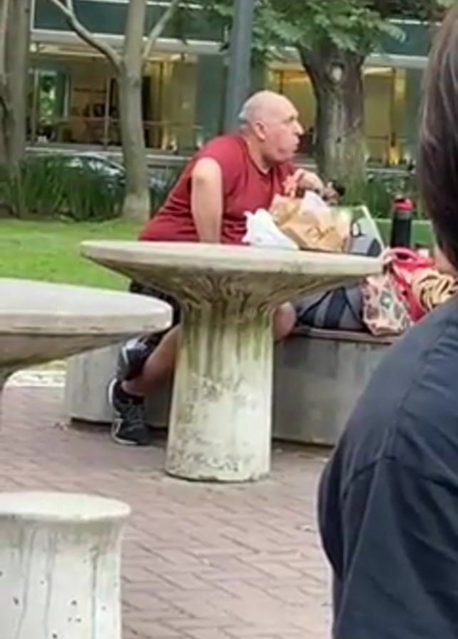 man eating at a concrete picnic table in a park. The man is bald and wearing a maroon shirt and black shorts with black and gray sneakers. He is sitting on the bench attached to the table and eating something from a paper bag. Behind him, there is a backpack and some bags. In the foreground, another person wearing a black t-shirt is partially visible with their back to the camera. The park has trees and grass, and there is a building in the background. The picnic table is on a brick-paved area.