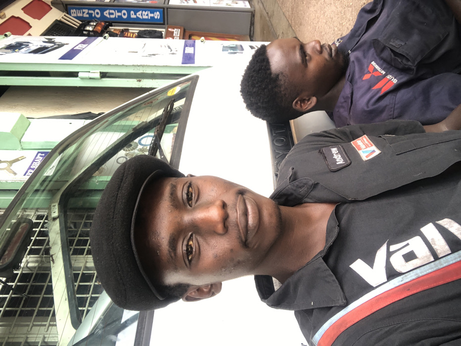 This image depicts two males in an outdoor commercial setting, identified as an auto parts shop, located in a city in Kenya