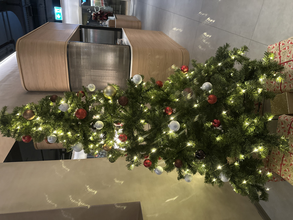 An overhead shot captures a decorated Christmas tree laden with silver, red, and gold ornaments, interspersed with glowing fairy lights. Gift-wrapped presents are stacked near the tree's base. In the background, a modern reception desk with a curved light wood finish and a ribbed glass partition adds to the festive ambiance of the space. The scene is well-lit, highlighting the details of the decorations.