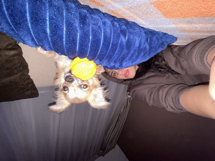 An indoor scene features one individual and one dog. An adult female with dark hair is lying on her back on a blanket with an orange, beige, and blue geometric pattern. She wears a brown hooded garment, and her face is visible, looking towards the camera with a slightly open mouth. Her right arm is raised, suggesting she is holding the camera. Next to her, a small, long-haired light-brown dog with erect ears is positioned on a prominent blue ribbed pillow. The dog holds a textured yellow ball in its mouth and gazes directly at the camera. The background includes a plain dark brown wall and a partially visible sheer, light-colored canopy or curtain on the right. The lighting is dim. This scene occurs within a private residence. No specific location within the city of Plovdiv, Bulgaria, can be determined from the visual evidence.