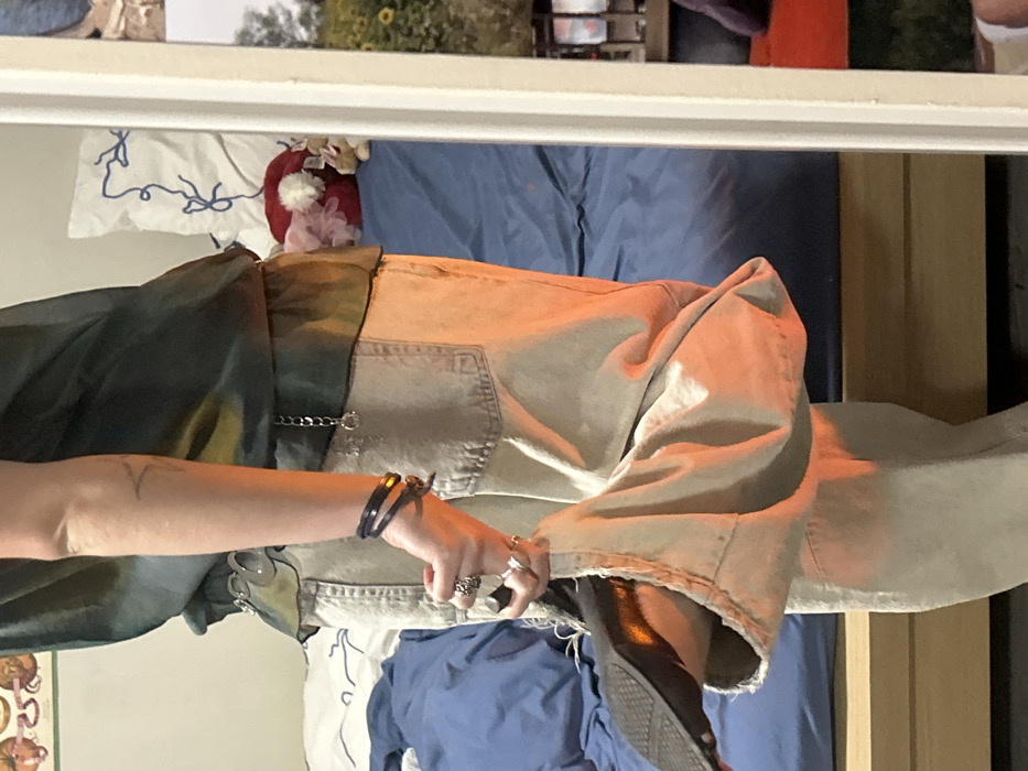 A person sits on a blue bed, wearing light-colored jeans and a dark green top. A silver chain is attached to their jeans. The person is wearing black bracelets on their left wrist and rings on their fingers. A black shoe is visible on their right foot. The bed has a white patterned pillow and a red and white decorative item. A shelf is above the bed with miscellaneous items.