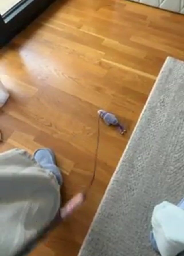 A person wearing light blue slippers and light blue sweatpants is standing in a room with wood floors and a light grey rug. They are holding a black rod with a string attached to a purple mouse toy. A black and white cat is lying on the rug, batting at the toy. The cat's paws are white and the rest of its body is black, with a white patch on its face. The cat is facing the person and playfully reaching for the toy.