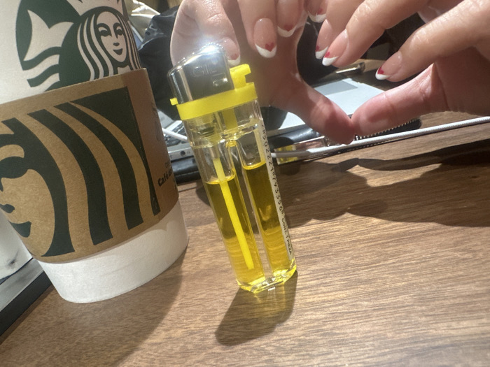 A Starbucks cup with a green logo sits next to a yellow lighter