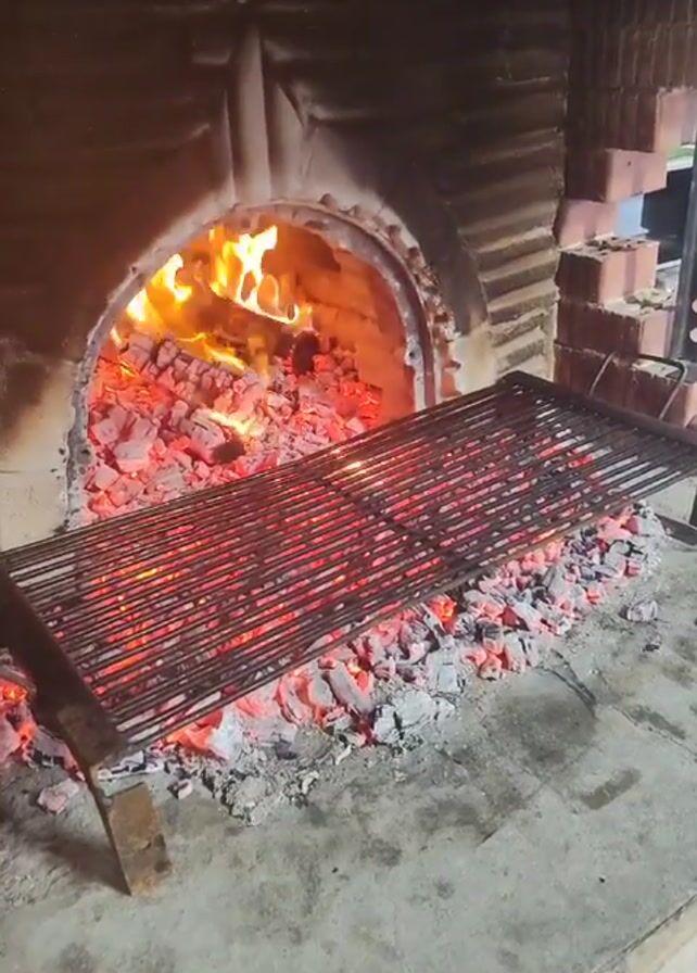 brick fireplace with flames and hot embers inside. A metal grill is placed in front of the fireplace. The area around the fireplace is made of concrete. No people are visible.