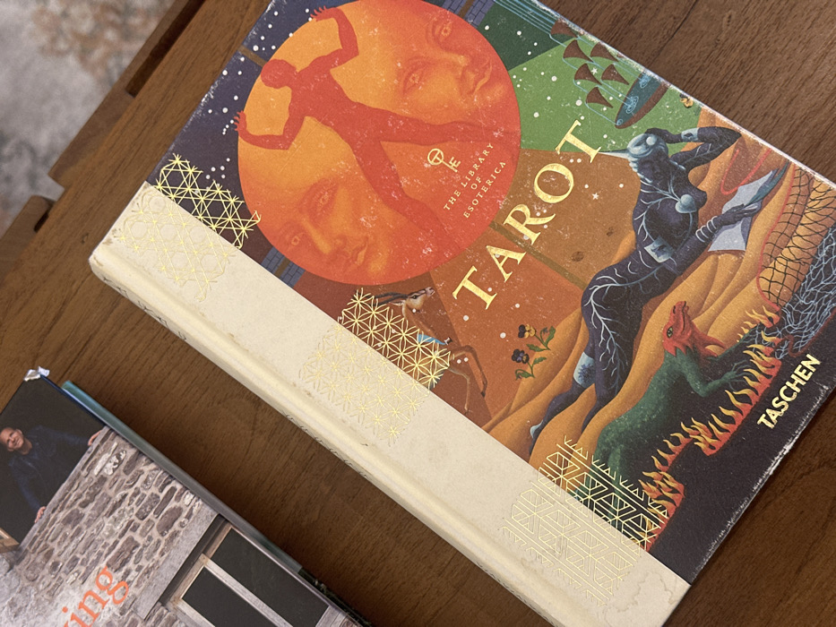 The scene presents two hardcover books on a dark brown wooden table surface. The foreground book, angled from top-left to bottom-right, is titled "TAROT" by TASCHEN, identified as part of "THE LIBRARY OF ESOTERICA." Its cream-colored spine area features gold geometric patterns and exhibits minor scuffs. The vibrant cover art includes a large orange circular motif depicting a red human silhouette and two subtle faces, overlaid on a dark blue starry sky transitioning to an orange-brown landscape. Featured elements on the cover include a reclining dark blue humanoid figure with visible anatomical lines, a green reptilian creature at the bottom left with flames, a partially visible deer-like animal, and a small, multi-sailed boat on the right. Behind and to the left, a second hardcover book is partially visible, showing a stone wall structure with a window and a light-skinned male with dark hair, wearing a dark shirt, smiling as he looks over the wall. The partial title "ing" is discernible. The wooden surface displays grain and reflections. The specific location in the city of Safed, Israel, is not discernible from the visual content of the image.