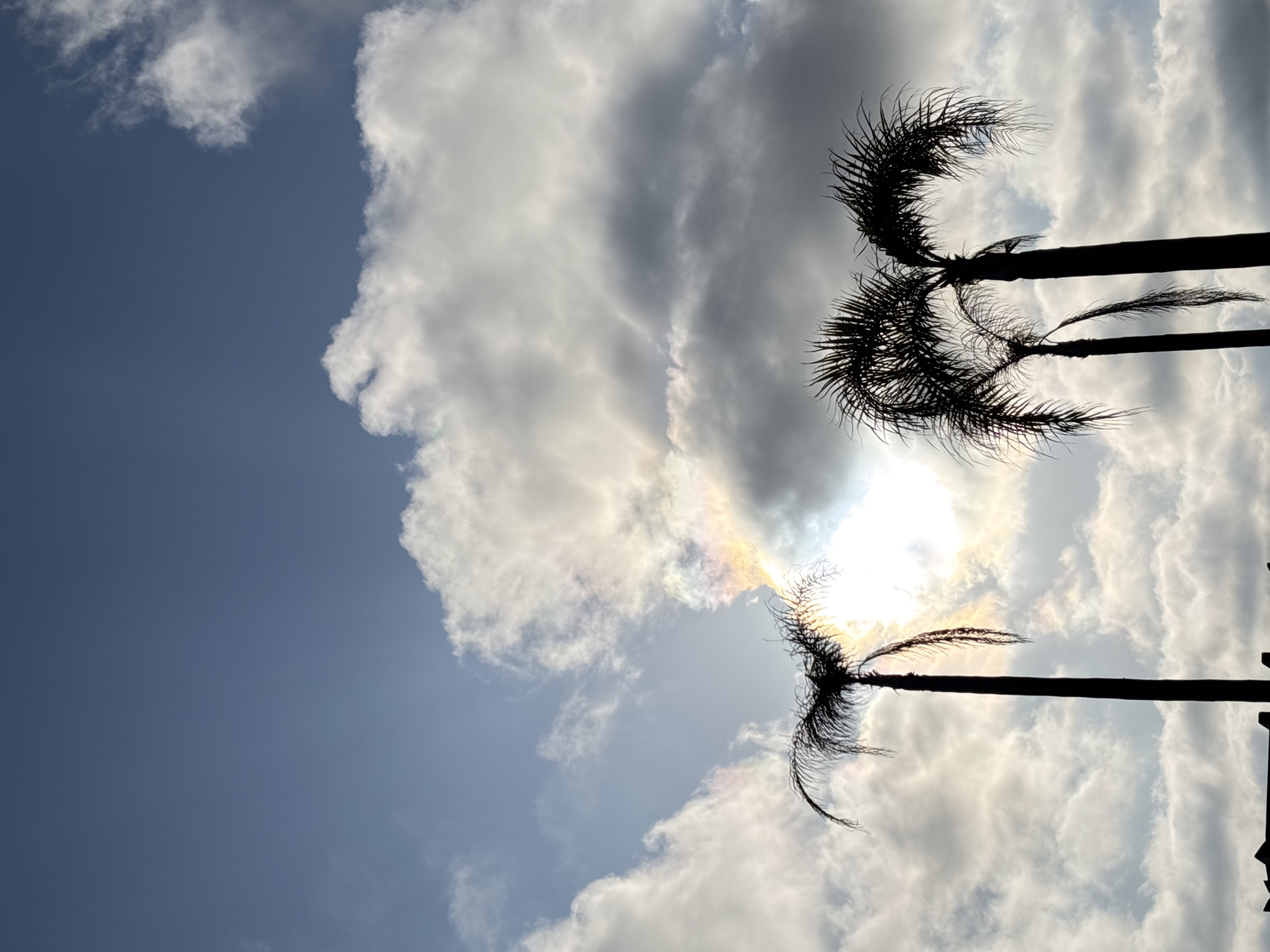The image displays an outdoor, daytime scene in M'Diq, Morocco, primarily featuring a sky with partial cloud cover. The upper portion of the frame shows patches of blue sky amidst white and grey cumulus clouds. A bright, obscured light source, consistent with the sun, is visible through a cluster of clouds in the mid-right, producing a distinct iridescent effect with visible rainbow-like coloration. Three palm trees are silhouetted against the bright sky and clouds. On the left, a single tall, slender palm tree with sparse, downward-curving fronds is present. To the right, two additional palm trees are grouped, both characterized by dense, drooping fronds, with one appearing slightly taller than the other. A dark, indistinct shape is minimally visible along the bottom edge of the frame. No human figures or discernible man-made structures are prominently depicted.