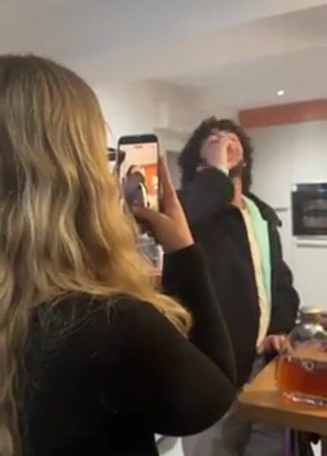 A woman is filming a video of a man drinking from a glass