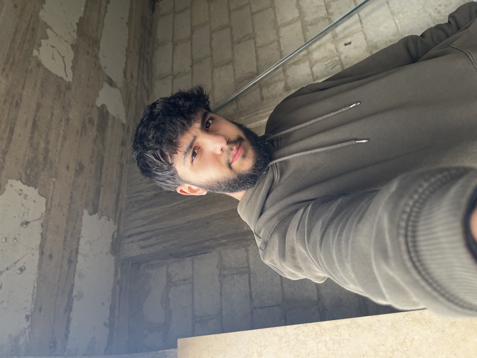 A male individual, appearing to be in his late teens or early twenties, is depicted in a close-up, chest-up selfie within an interior setting in Al-Midan Municipality, Syria. He has dark, curly hair and a dark beard, looking directly at the camera with a neutral expression. He is wearing a dark olive green hooded sweatshirt with visible drawstrings that have silver tips. The background consists of rough, unpainted cinder block walls and exposed concrete surfaces. The ceiling above shows patches of peeling plaster or concrete, indicating a state of construction or disrepair. To the left, a light-colored, possibly wooden or plasterboard panel is visible leaning against a wall. To the right, a metallic bar or railing extends diagonally upwards. The lighting appears natural, illuminating the subject and the immediate surroundings.