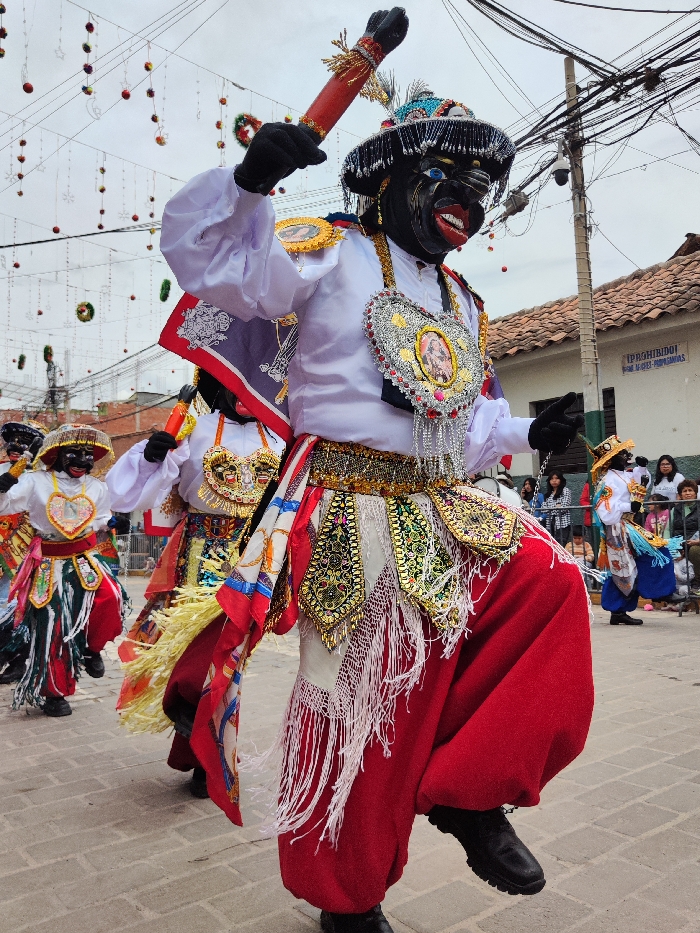 Three people in traditional clothing dance on a brick-paved street. The person in the foreground wears a black mask, white top, red pants, and black boots. They hold a decorated red club. Intricate gold and silver decorations adorn the clothing. Other people stand behind them watching. Garlands hang above the street, and buildings are visible in the background.