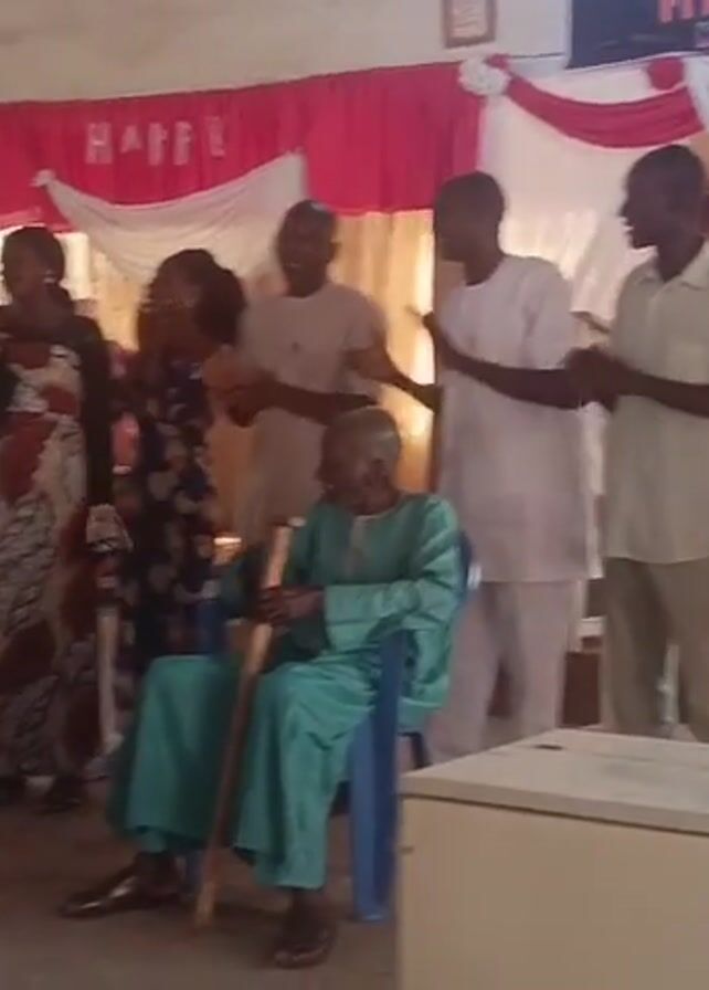 group of people gathered in what appears to be a hall or church for a celebration. There are about 12 people standing, and one elderly man is seated on a blue plastic chair, holding a walking stick. Some of the people standing are clapping their hands and singing. The women are wearing different patterned dresses and head coverings, while the men are dressed in casual shirts and trousers. In the background, there is a decorated stage with red and white fabrics, and the word "HAPPY" is visible. There is a banner with lettering on it as well, reading "FITH UNI NUM". In front of the seated man is a white box. A man on the right of the frame is looking at a phone. The room has light-colored walls and a tiled floor. The overall atmosphere seems festive. The video ends with the camera moving and showing more of the right side of the room.