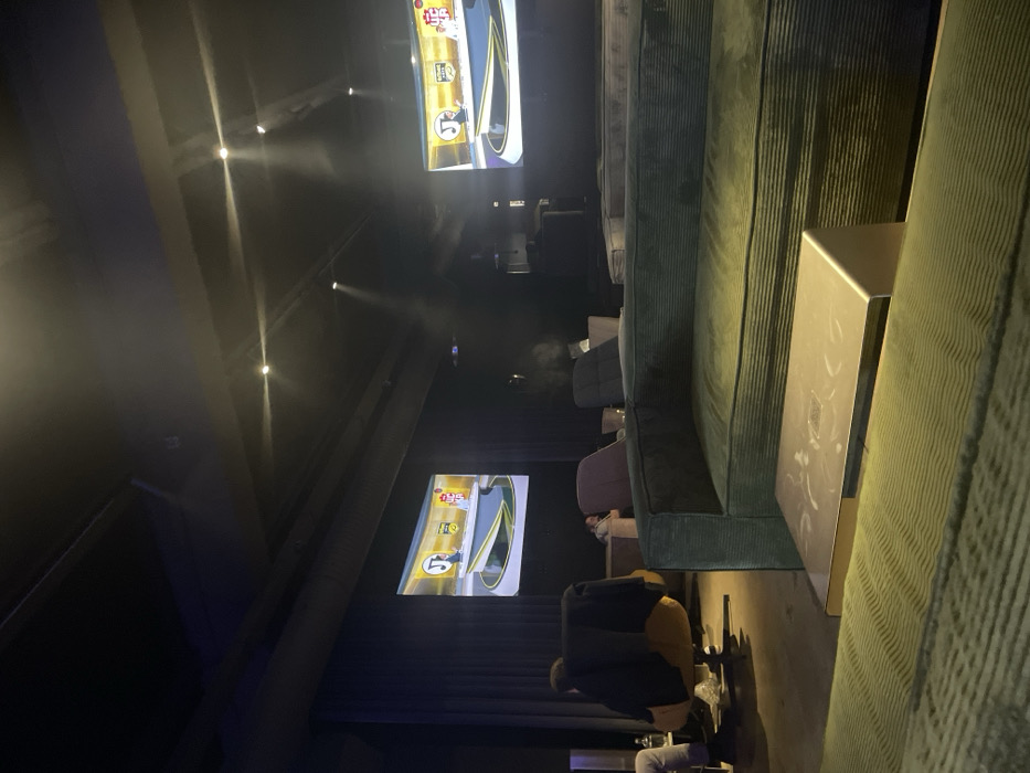 The image displays a dimly lit, modern lounge or viewing area located in Sofia, Bulgaria. The precise street address or specific venue within Sofia cannot be determined from the visual evidence. The scene is characterized by dark walls, a dark ceiling with exposed infrastructure, and multiple recessed spotlights casting beams of light. In the foreground, a large, olive-green sectional sofa with horizontal ribbing occupies the lower and right portions of the frame. A low-profile, rectangular metallic coffee table, exhibiting surface smudges or reflections, is positioned directly in front of this sofa. In the mid-ground to the left, a person is partially visible, seated on an orange-brown swivel armchair with a dark jacket draped over the backrest. Only their lower body, clad in light trousers and dark shoes, is discernible. Further into the mid-ground, another individual is reclined in a purple armchair, facing away from the camera. Several other unoccupied, modern armchairs and sofas in varying shades of grey and purple are arranged in clusters throughout the space. Two large projection screens or displays are prominently featured on the far walls. Both screens are simultaneously displaying what appears to be a live broadcast or recorded program. The content shows a male presenter seated at a desk within a stylized studio featuring bright green and yellow accents. On-screen graphics include the letters "JT" and the Bulgarian word "КУПА" (KUPA), indicating a sports news or commentary segment, likely pertaining to a cup competition. The overall environment is designed for comfort and viewing, with a subdued lighting scheme contributing to an intimate, relaxed atmosphere.