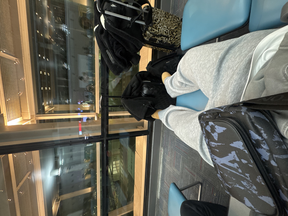 The image depicts an airport terminal waiting area at night, specifically located in Yerevan, Armenia. The scene is observed from a low perspective, primarily focusing on the lower body of an individual and their immediate surroundings. A person's legs, wearing light grey sweatpants, are extended across two empty light blue upholstered airport seats. Their feet, clad in light tan or beige footwear, rest at the far end of the seats. A dark messenger-style bag with a black and blue abstract pattern is positioned on the individual's lap area. To the left, a partial view of another dark-clad leg and an additional light blue seat are visible. The floor is covered with a multi-patterned carpet featuring blues, greys, and red accents. Adjacent to the person's legs on the right, multiple pieces of luggage are present. This includes a wheeled suitcase featuring a black and tan leopard print pattern, over which a black fleece jacket with a white interior collar is draped. A black bag, possibly a backpack, rests next to the leopard print suitcase. Another black wheeled suitcase handle is partially visible further to the right. The midground features a large glass window wall separating the interior terminal from an exterior tarmac or service area, which is illuminated by artificial lights under dark, nighttime conditions. Yellow and white striped ground markings, consistent with a service road or crosswalk, are visible outside. The window exhibits reflections of interior overhead lighting fixtures, distant indistinct human figures, and a red light source (possibly a sign). The background beyond the window remains indistinct but suggests typical airport infrastructure.