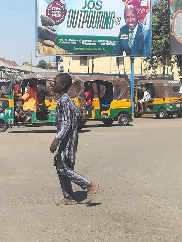 A young male, possibly a pre-teen, walks from left to right across a paved road under bright sunlight. He wears a full-length, long-sleeved, vertically striped garment in shades of blue and white, paired with light-brown, textured, open-toed slip-on sandals. His head is shaved short, and his gaze is directed forward. In the background, several three-wheeled auto-rickshaws, commonly known as "Keke Napep," are visible. These vehicles feature green bodies, yellow sections, and brown canopies. Occupants are discernible within at least three of these vehicles; one on the far left has a person in an orange top, another behind the walking male has a person in red, and a third further right contains a person in a white top. Dominating the upper portion of the image is a large billboard advertising "JOS OUTPOURING 2026." The billboard features an image of a smiling man in a suit (identified as Apostle Johnson Suleman by visible text) and details an event scheduled for February 17th, 18th, and 19th (Ministers Conference), to be held at "Jos Polo Field, Plateau state." The left side of the billboard displays an image of stacked rocks. The scene is an urban environment in Jos, Plateau State, Nigeria, characterized by local transportation and large-scale public advertising, under a clear blue sky.
