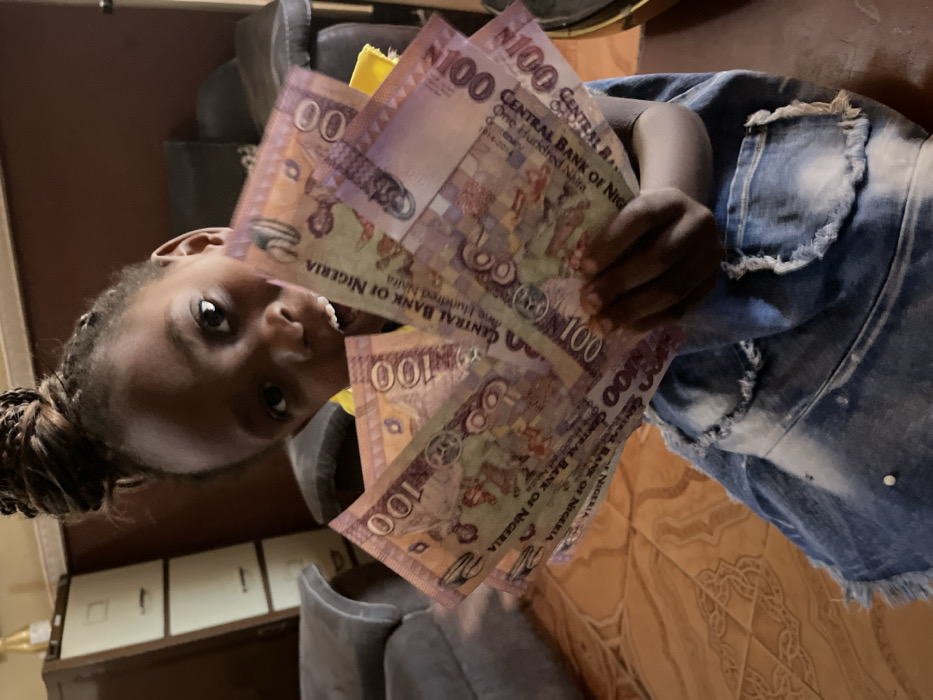The image displays a young child, appearing to be female, with dark skin and braided hair styled in a bun. The child is positioned in the foreground, looking directly at the camera with an open-mouthed, excited expression. She is wearing a yellow garment beneath a light-wash denim-style pinafore dress with frayed hems and hip pockets. In her left hand, the child holds a fanned stack of at least five 100 Nigerian Naira banknotes, extending them towards the viewer. The notes are predominantly purple/pink and green, clearly displaying "CENTRAL BANK OF NIGERIA" and "One Hundred Naira." The scene is set indoors, likely a residential living area in Jos, Nigeria. In the background to the left, a partial view of a gray upholstered armchair is visible. Further left and behind the child, a light brown three-drawer cabinet or chest is present, topped with a light-colored object. To the right, a dark brown or black upholstered armchair is partially visible. The floor is tiled with an orange-brown hue, featuring a patterned design. The walls in the background are dark brown. Lighting appears consistent with an indoor setting.