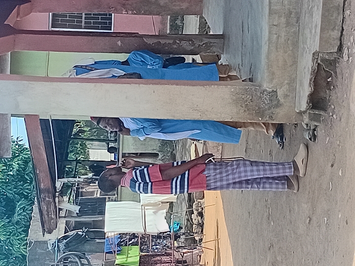 The image depicts three males interacting outdoors on an unpaved dirt ground in an unspecified city. On the left, a dark-skinned male wears a red, white, and blue horizontally striped short-sleeved shirt, red and white checkered pants, and light-colored slip-on shoes. He holds a string of dark prayer beads in his left hand and has his right hand raised near his mouth, facing towards the right. A second dark-skinned male stands partially behind a light-colored concrete pillar, wearing a light blue long-sleeved tunic, brown trousers, dark slip-on sandals, a red cap, and a white cloth draped over his left shoulder; his left hand is raised to his chin, and he faces left towards the first individual. A third male is mostly obscured behind the concrete pillar, wearing a similar light blue tunic and brown trousers with a white cloth draped over his head. In the left background, a clothes drying rack holds laundry near a structure featuring a visible bicycle wheel. The right side of the scene is dominated by the concrete pillar, with broken concrete steps at its base, fronting a pink-painted building wall that includes a window fitted with security bars. Trees are visible in the distant background.