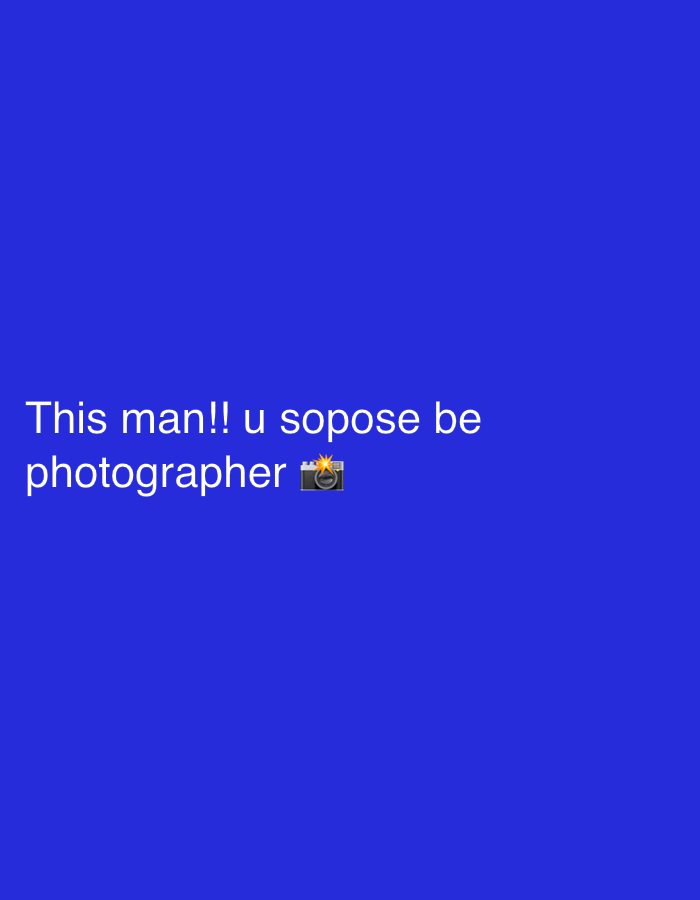 A dark blue image displays the text, "This man!! u sopose be photographer 📸