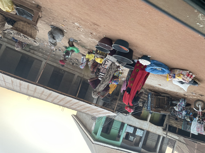 A bustling open-air market scene is shown, with people selling various goods. Some vendors carry items on their heads, while others display goods like clothes, buckets, and possibly food items on mats or makeshift stands. A building with corrugated metal roofing provides some shelter, and a motorcycle is parked nearby. The ground appears to be reddish dirt or soil.
