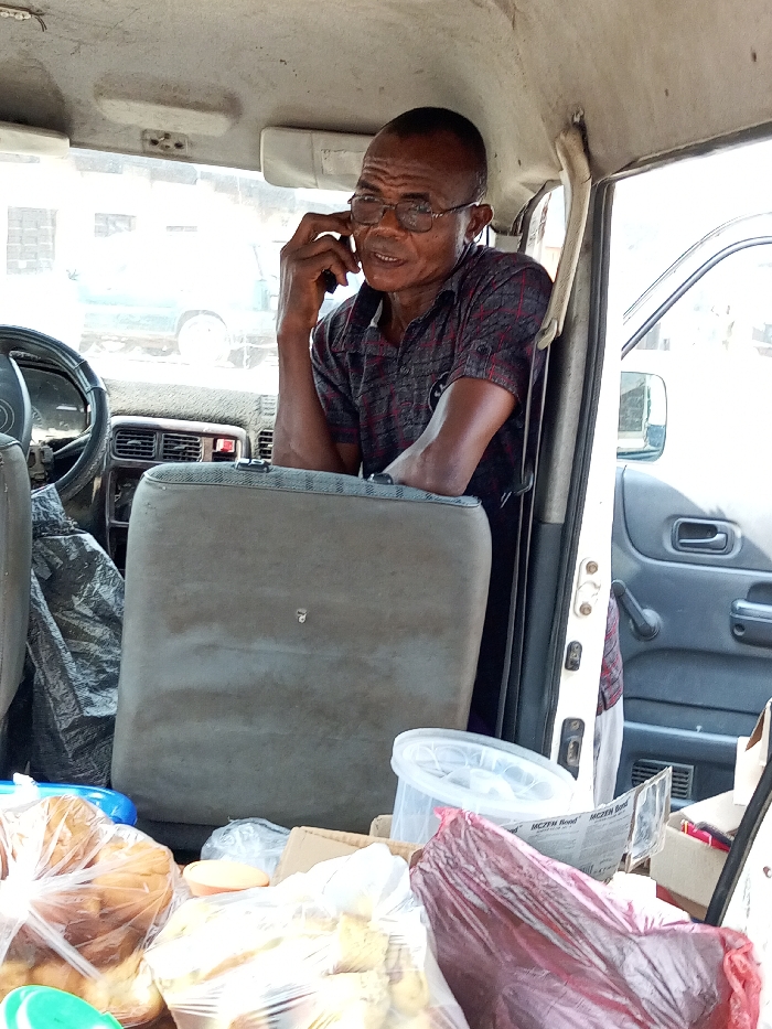 An older man wearing glasses stands in the doorway of a white van, talking on a cell phone. The van's interior is cluttered. He wears a patterned short-sleeved shirt. In front of him is a worn seat, and below it, several plastic bags, some containing food, a clear plastic container, and miscellaneous items. The dashboard is visible, dusty, and worn. Outside the van, a glimpse of another vehicle is seen.