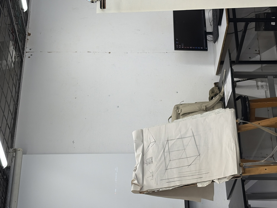 The image depicts an indoor studio or classroom located in Ramat Gan, Israel; the specific address is not identifiable. The room features plain white walls with minor scuffs and a vertical seam down the center-right. The ceiling is an exposed grid with visible fluorescent light fixtures. In the foreground-left, a wooden easel supports a large pad of off-white paper. The visible sheet displays multiple pencil sketches, primarily illustrating perspective drawing techniques with outlines of cubes and rectangular forms. The paper is somewhat creased. To the left of the easel, a white projector screen is visible, displaying a faint, unidentified projection with interface elements discernable at the bottom. In the mid-ground, a beige-colored backpack rests on a dark surface directly behind the easel. To the right, two desks are positioned against the wall. The rear desk holds a black computer monitor with a dark screen, a black keyboard, and a mouse. The front desk, dark in color, has a single sheet of white paper placed on its surface. No individuals are present, and no actions or interactions are actively occurring in the scene.